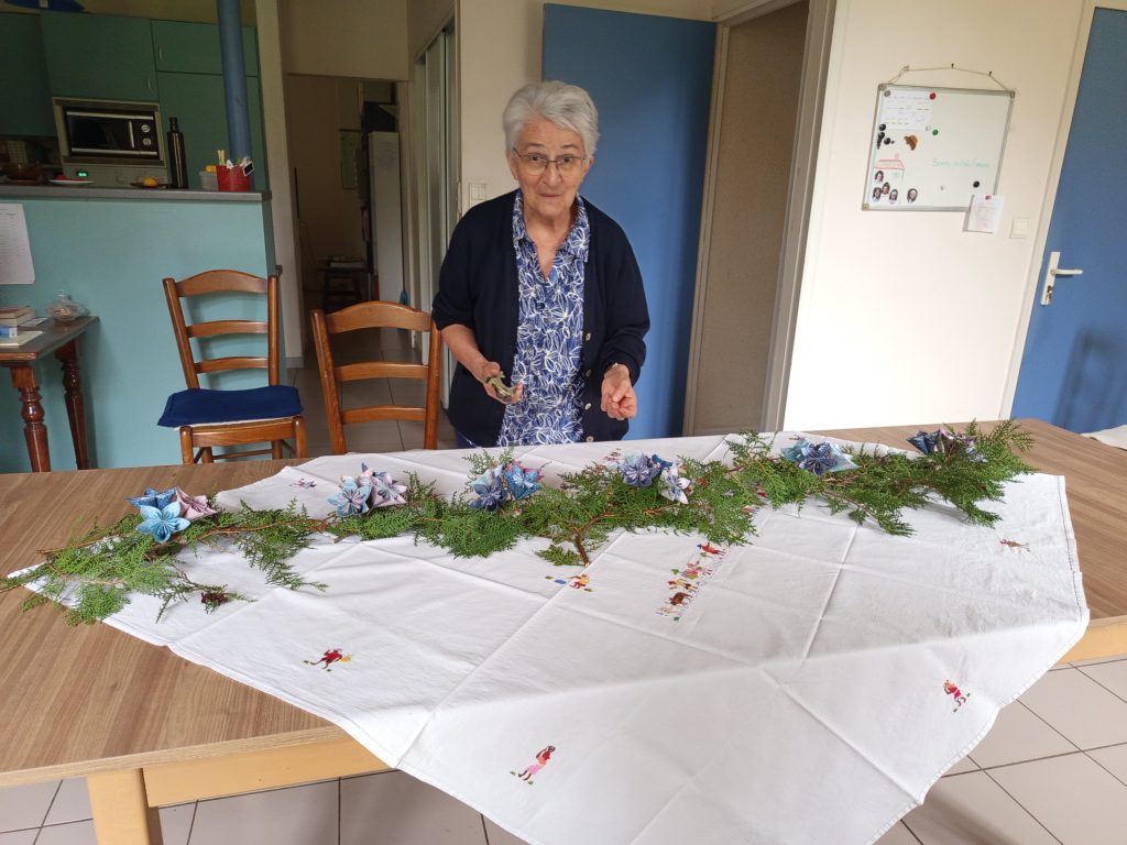 Ce projet nous a toutes mises en route. Bernadette, pleine d’idées, a confectionné de très jolies petites fleurs en origami et a pu ainsi dresser une très jolie table dans la salle à manger. Les fleurs disposées en bouquets sur une magnifique nappe malgache ont suscité beaucoup d’admiration !